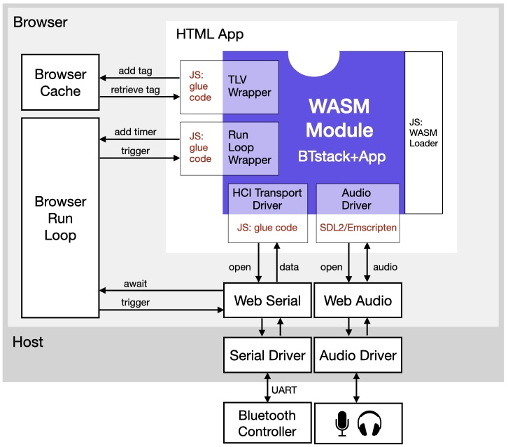 Porting BTstack to run in the browser via WebAssembly required navigating a series of architectural mismatches between native C code and the Web runtime. Browser sandboxing prevents direct access to hardware, storage, and serial ports, forcing all interaction through a user-mediated, asynchronous JavaScript API. This clashed with one of the few synchronous BTstack’s function calls, particularly for UART baud-rate changes, and ultimately required deeper integration techniques such as Emscripten’s Asyncify to suspend C execution across asynchronous boundaries. Efficient C–JavaScript interoperability demanded a solid understanding of calling conventions and Emscripten’s shared memory model to avoid unnecessary data copies. Additional adaptations were needed for persistent storage and audio output, leading to the use of the browser storage API and the use of the portable SDL2 framework to maximize reuse across web and non-Web platforms.