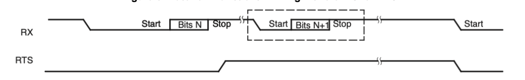We couldn’t find clear standards/documents about when RTS exactly should go up, but Texas Instruments’ User Guide for the TMS320DM644x DMSoC UART indicates that the UART in their DSP raises RTS in the middle of the first stop bit.