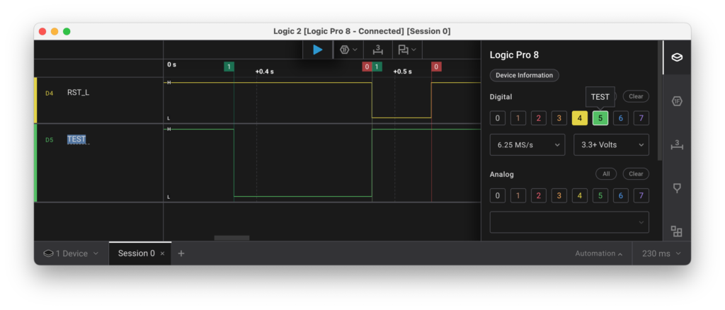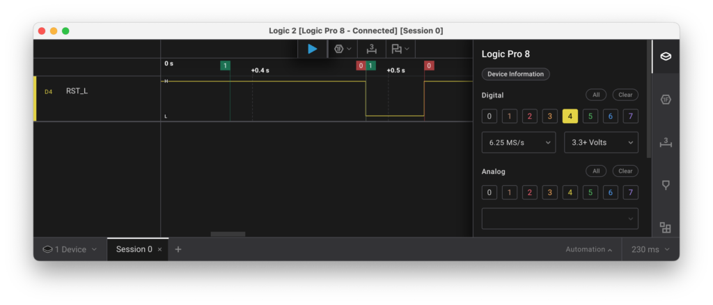 When connecting the logic analyzer to RST_L, we expected a line that goes low for 100 ms before going up again. However, we got this unexpected trace: