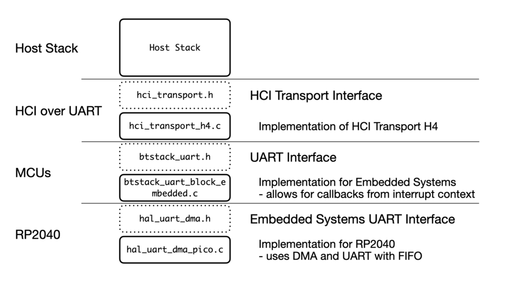 As the CYW20820 provides an HCI UART interface, we use BTstack’s hci_transport_h4.c implementation, which handles the framing and parsing of HCI packets over a serial connection like a UART. hci_transport_h4.c in turn requires an instance of btstack_uart.h to send and receive blocks of data to the Controller.